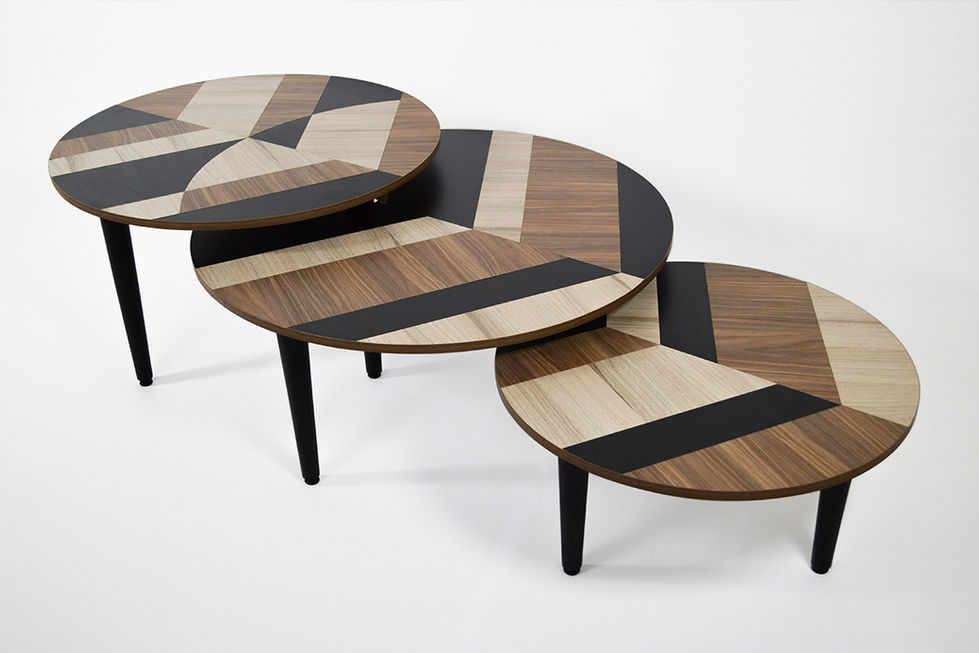 Inspirado en los patrones que forman las hojas de árbol, LEAVES es un juego de tres mesas de centro con diferentes alturas y configuraciones de acomodo. Cuenta con un diseño geométrico en la cubierta el cual crea un efecto visual de interposición y patrones, según el acomodo escogido.